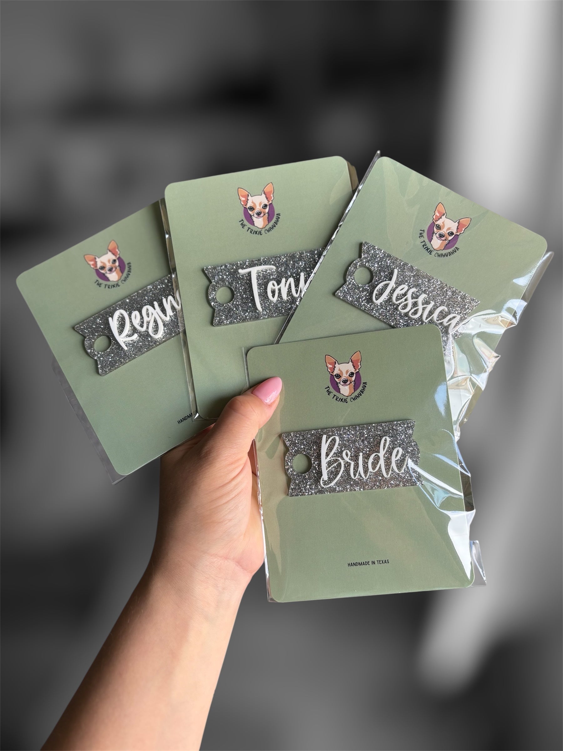 This topper will match the silver base with write bride lettering for your bridesmaids. (See photo)