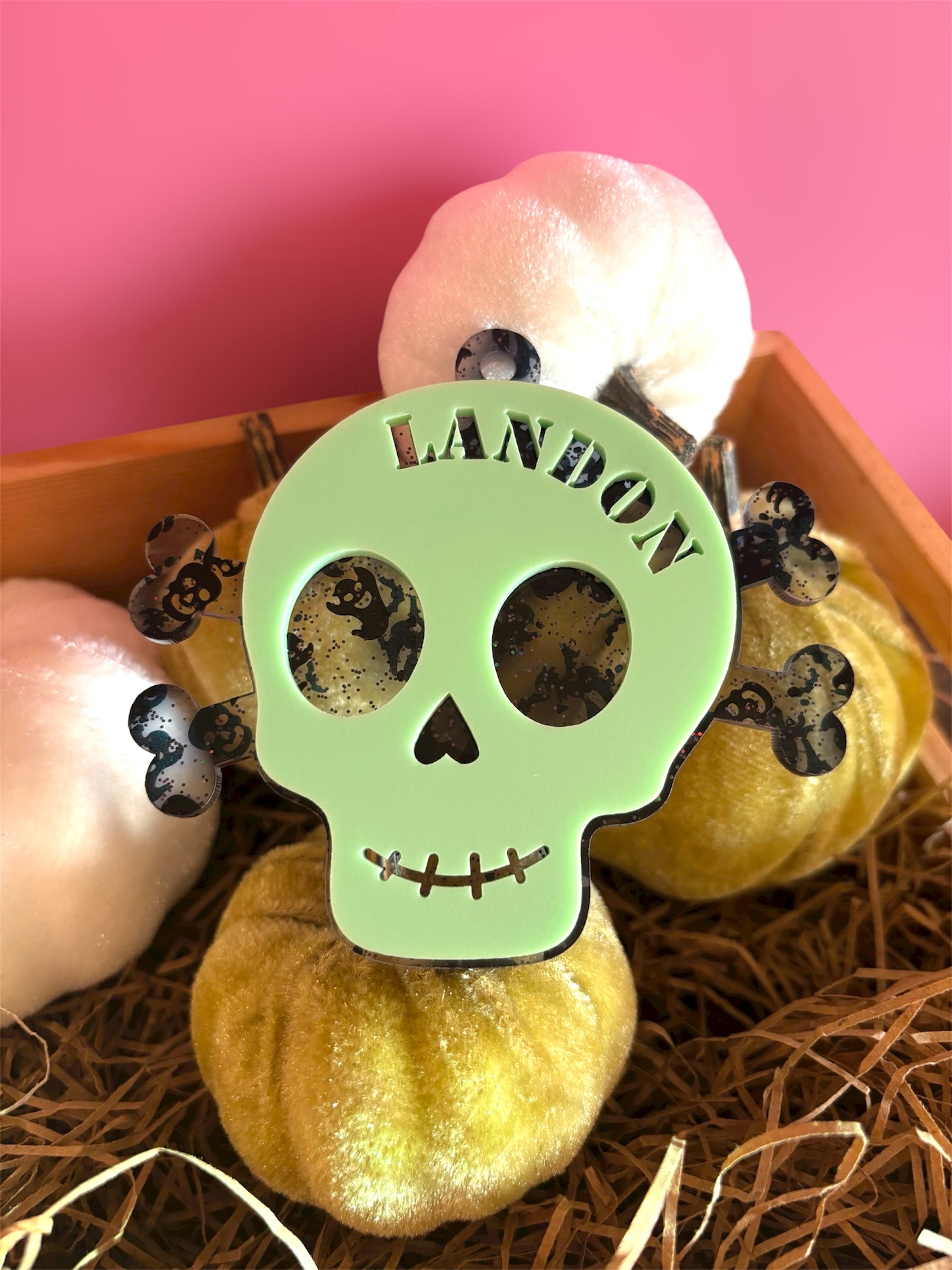 Add a spooky touch to your Halloween baskets with these adorable acrylic skull name tags! Each one is custom laser-cut with your name and features layered acrylic details for a fun pop of color.